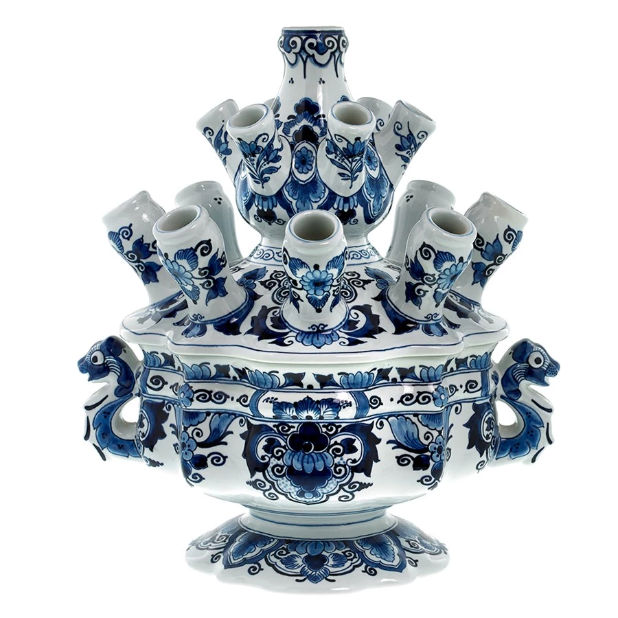 Classic blue and white color palettes with flower and leaf motifs. Removable lid has 14 spouts for displaying your favorite tulips in all their radiant colors. Entirely handpainted in Holland in the same workshop in production since the 17th century. Exclusively at Scully & Scully.