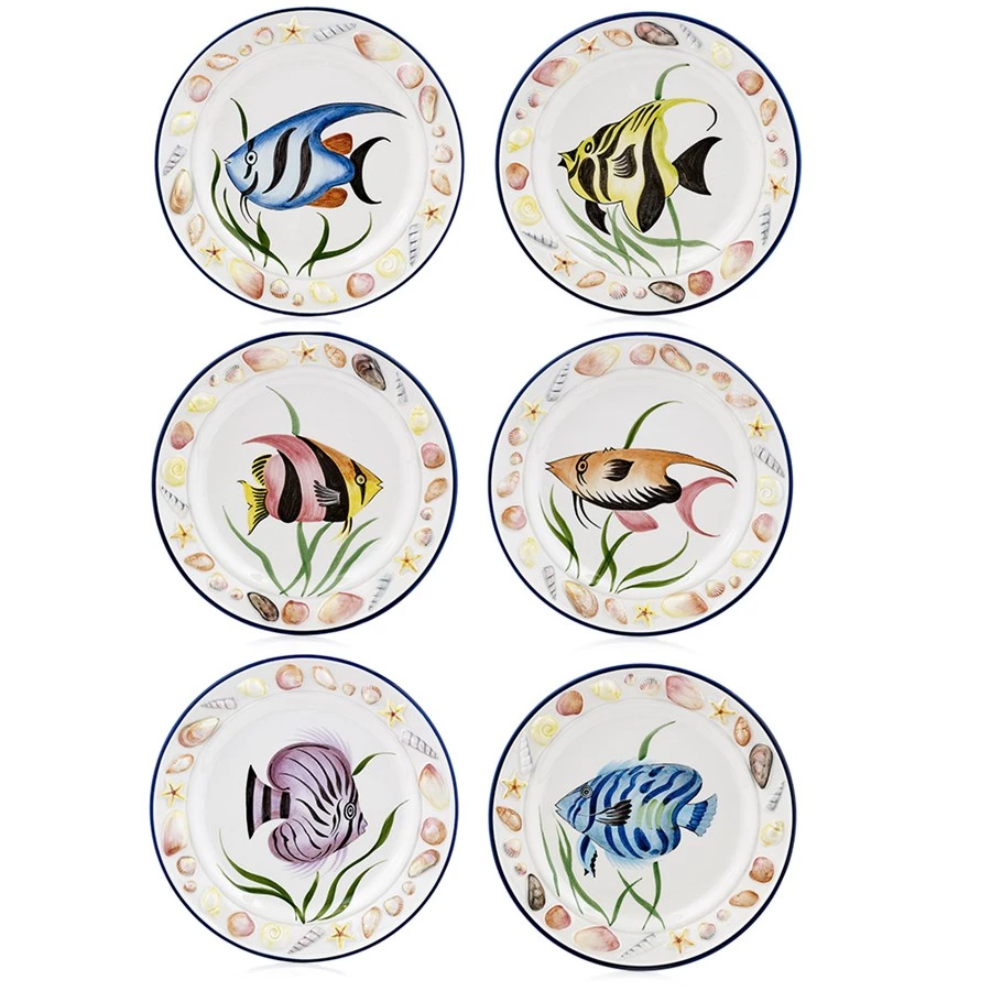 The salt air comes to your table with these vibrant handpainted plates. Handmade exclusively for us, this set of six has sculptured shells forming a dazzling three-dimensional border. Marvelously suited for wall display as well as table use. Handmade in Italy. Exclusively at Scully & Scully.