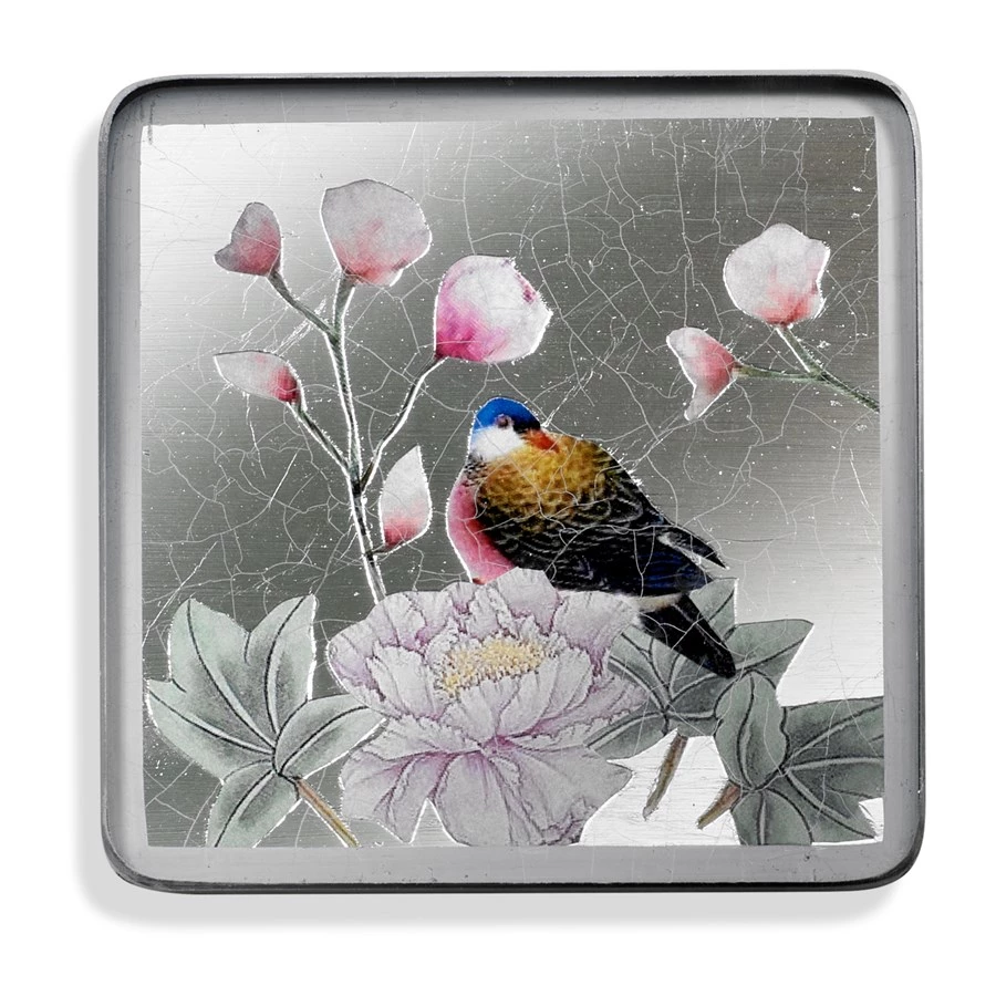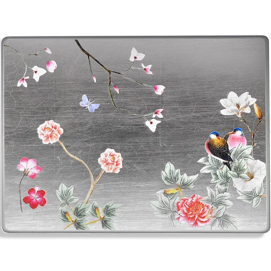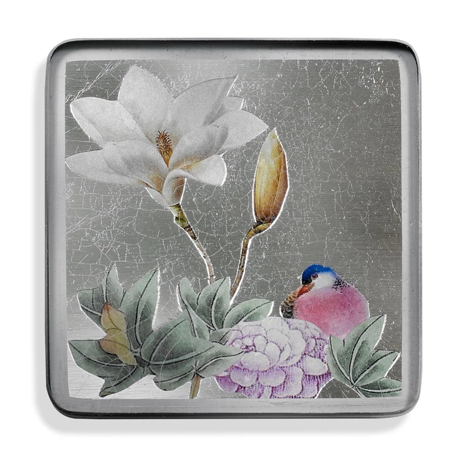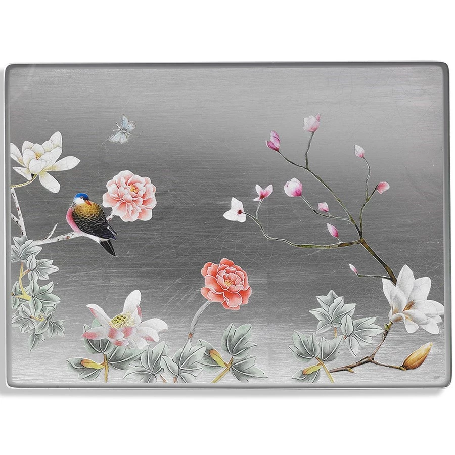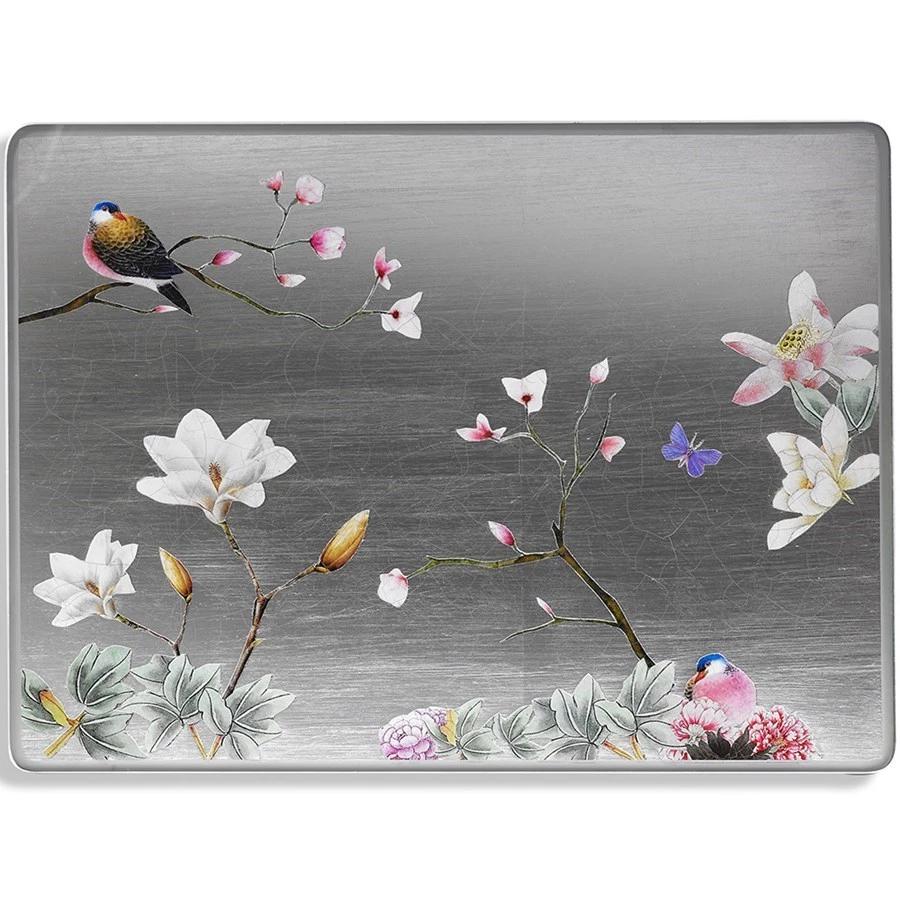 The traditional art of decoupage on rectangular mats and coasters handcrafted of glass with protective felt backing. The decoupage Japanese blossom and bird prints stand out against the beautiful crackled silver finish. Mats can hold warm plates. Made in England. Exclusively at Scully & Scully.