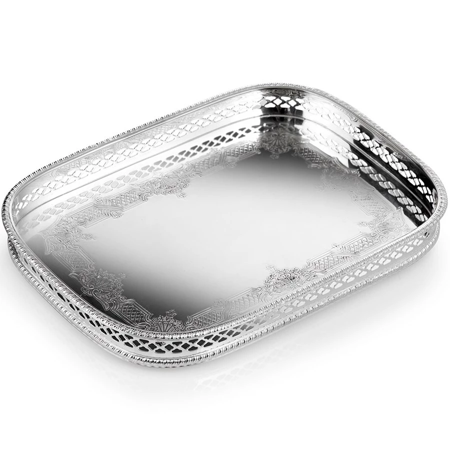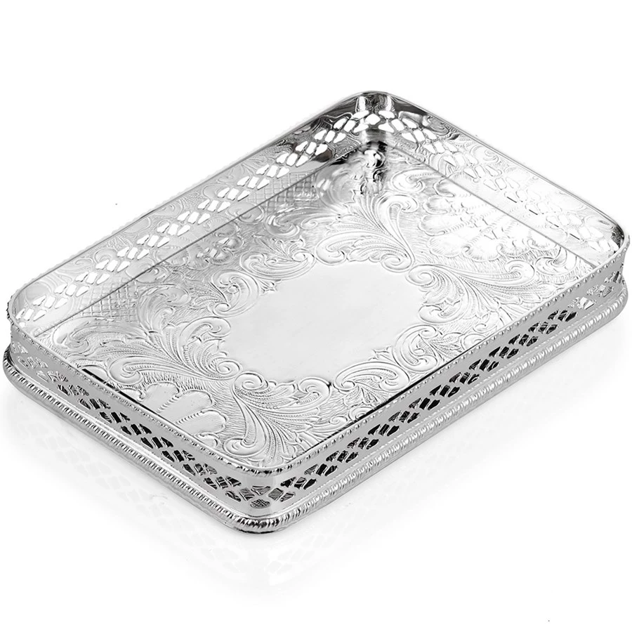Silverplate on copper from the master silversmiths of Sheffield. Ornate scroll designs and openwork galleries make impressive card trays for any office or home entryway. Handmade in England. Exclusively at Scully & Scully.