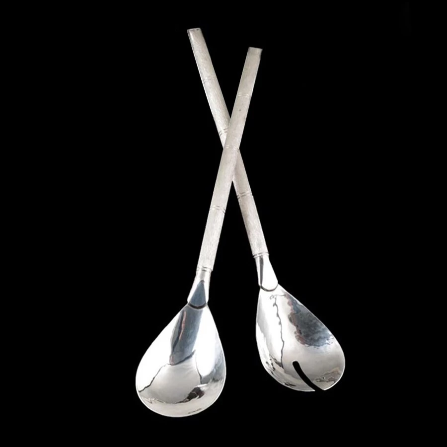 Beautiful handmade contemporary interpretations in silverplate over bronze, exclusively at Scully & Scully. Salad bowl with four ball feet. Salad servers have textured bamboo-style handles. Bowl and servers sold separately.