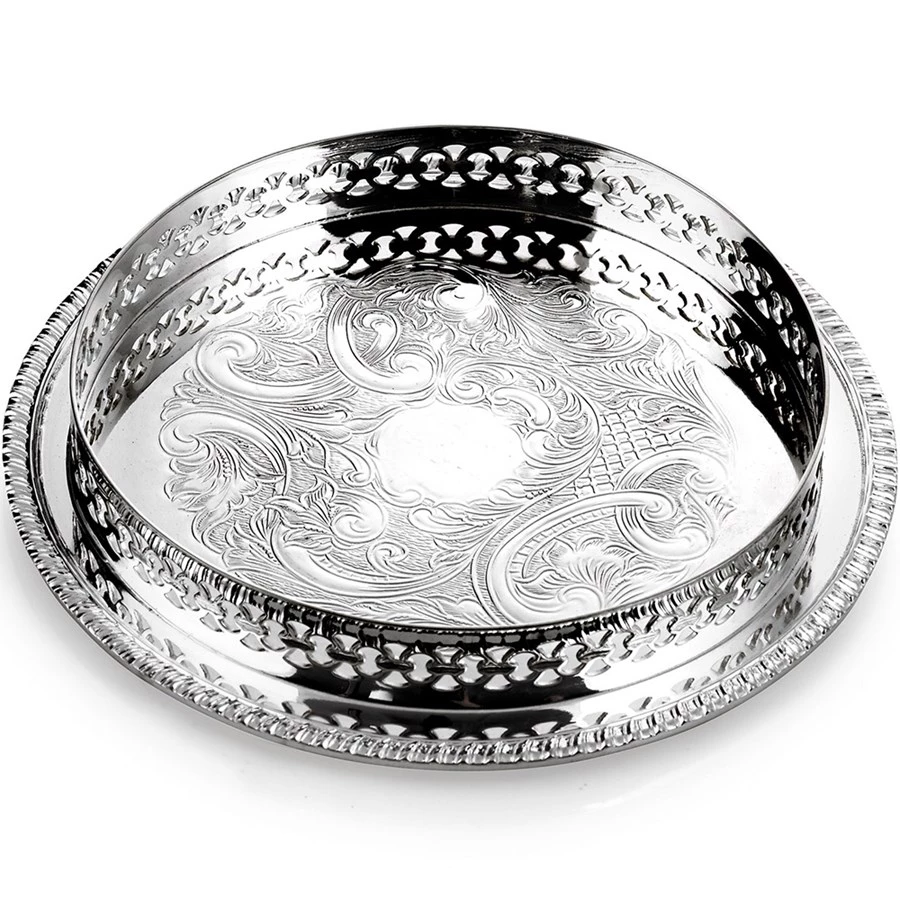 Elegant wine coaster is handcrafted of silverplate copper in Sheffield, England. Features an ornate scroll design and openwork gallery, showcasing the craftsmanship of the silversmith. Protects your surfaces from spills in style. Handmade in England. Exclusively at Scully & Scully.