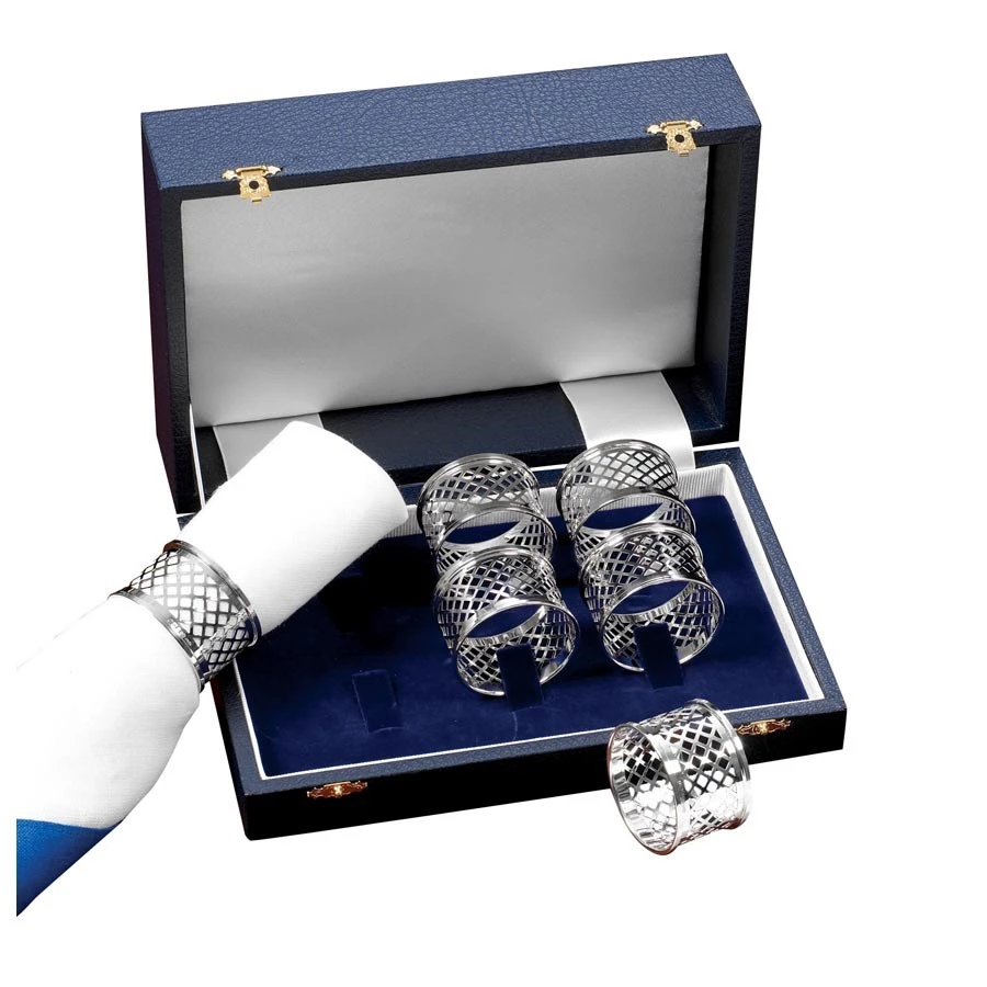 Set of six napkin rings handcrafted of hallmarked sterling silver. The fitted box is lined to protect each napkin ring when not in use. Handmade in England. Exclusively at Scully & Scully.