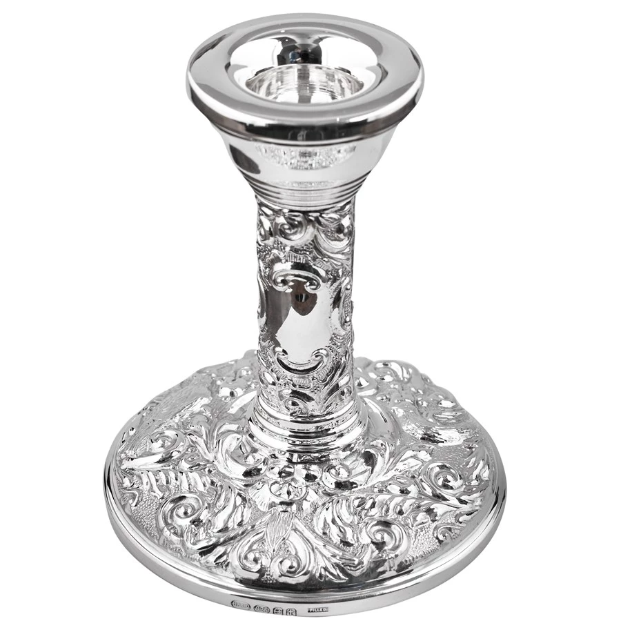 Ornate scroll design on hallmarked sterling silver. Felt bottoms to protect your furniture. Particularly effective as a pair. Handmade in England. Exclusively at Scully & Scully.