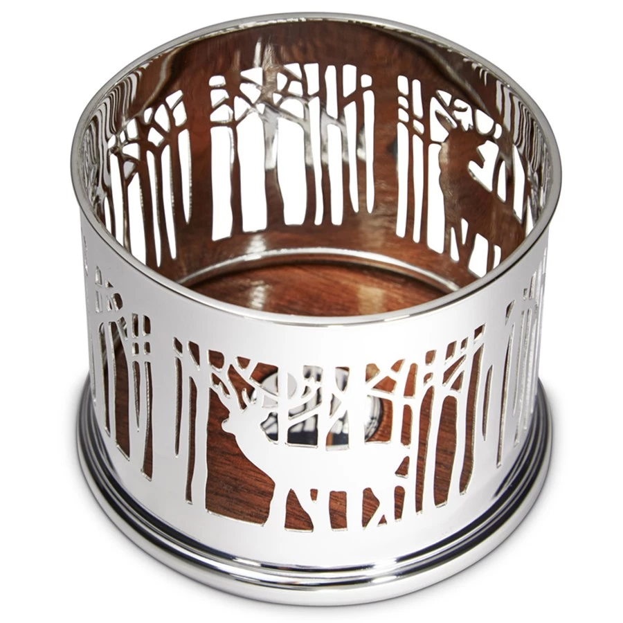 Protect your table with a substantial hallmarked sterling silver bottle coaster showcasing the finest craftsmanship. Designed by James Bailey, the coaster body boasts incredible hand-piercing, creating a scene of a stag making its way through a forest. The base is American Black Walnut. Handmade in England. Exclusively at Scully & Scully. For a one-of-a-kind gift have your medallion in center engraved with a monogram or special date. Three initials or classic monogram (last initial larger and in center) $24. Please allow one week for engraving.