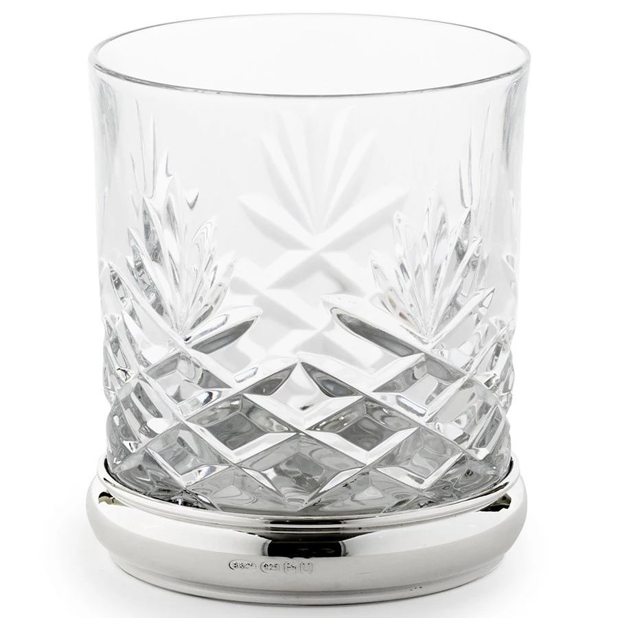 Blending contemporary design with a tradition of workmanship that dates to the Edwardian period, these double old fashioned glasses are styled of fine crystal offset handcut with diamond and frond detailing with hallmarked sterling silver bases. Handmade in England. Exclusively at Scully & Scully.