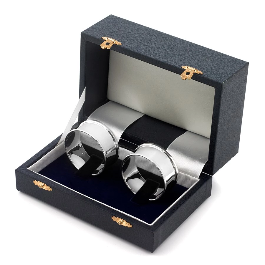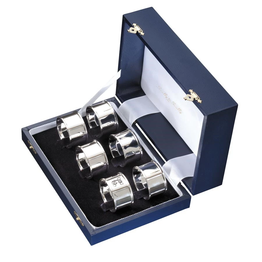 For your gracious table settings, these round rimmed napkin rings are handcrafted hallmarked sterling silver. They come in their own fitted and lined presentation and storage box. Handmade in England. Exclusively at Scully & Scully. Three letter monogram is $24 per ring. Please allow one week for engraving.