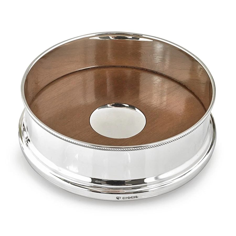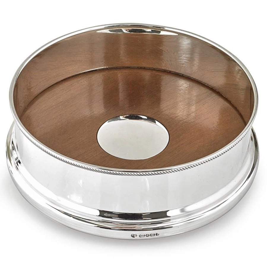 The Sterling Silver Rope Coaster is handmade in England, with beautiful rope detailing along the rim of the coaster. Hallmarked sterling silver with a finished American black walnut wood base. Handmade in England. Exclusively at Scully & Scully. For a one-of-a-kind gift have your medallion in center engraved with a monogram or special date. Three initials or classic monogram (last initial larger and in center) $24. Please allow one week for engraving.