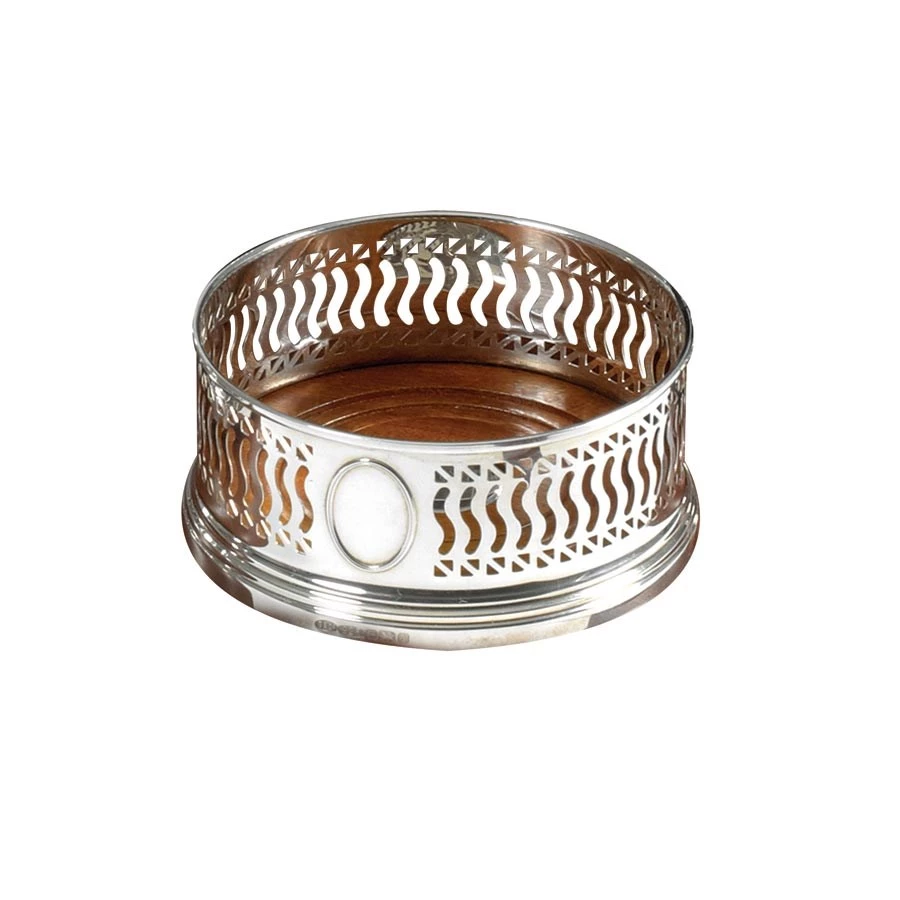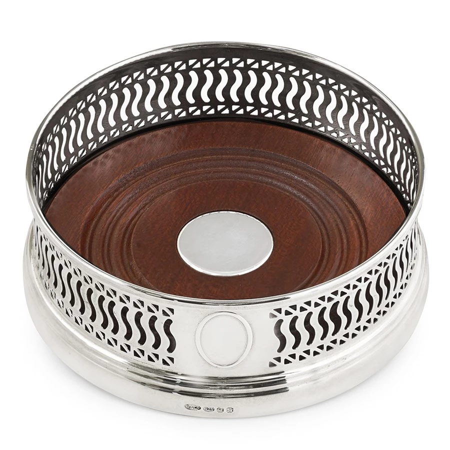 Protect your table with elegant stewards for your finest wines. Each has hallmarked sterling silver medallion, mahogany base and felt bottom. Handmade in England. Exclusively at Scully & Scully. For a one-of-a-kind gift have your choice engraved with a monogram or special date.Three initials or classic monogram (last initial larger and in center) $24. Please allow one week for engraving.