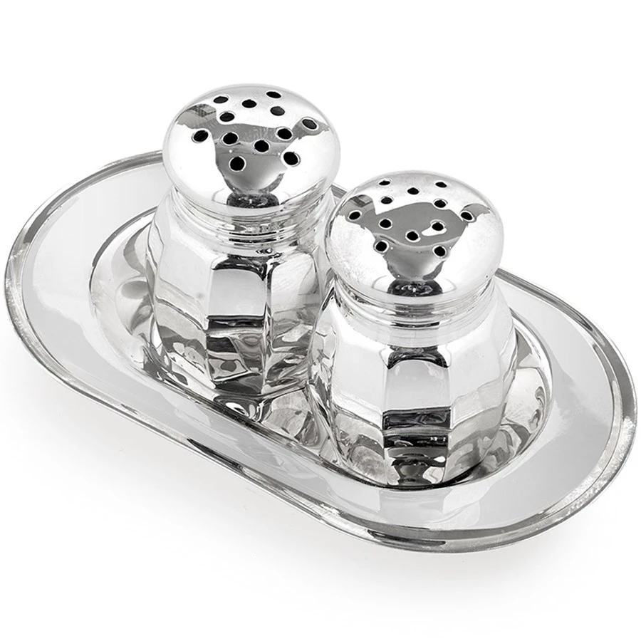 Three pieces design a handsome salt and pepper set handcrafted in the United States. The set includes a salt and pepper shaker along with a tray for the two pieces to fit. Forged from .925 sterling. Handmade in America. Personalize the tray for a treasured keepsake. Three initials or classic monogram (last initial larger and in center) $24. Additional characters (including punctuation) extra. Please allow one week for engraving.Â