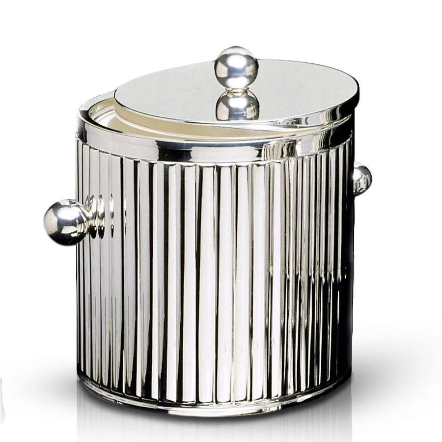 Add a sophisticated touch to your bar with this elegant ice bucket. Refreshing “Sticks” pattern of vertical grooves on well-made silver piece from Italy. Fixed plastic liners.
