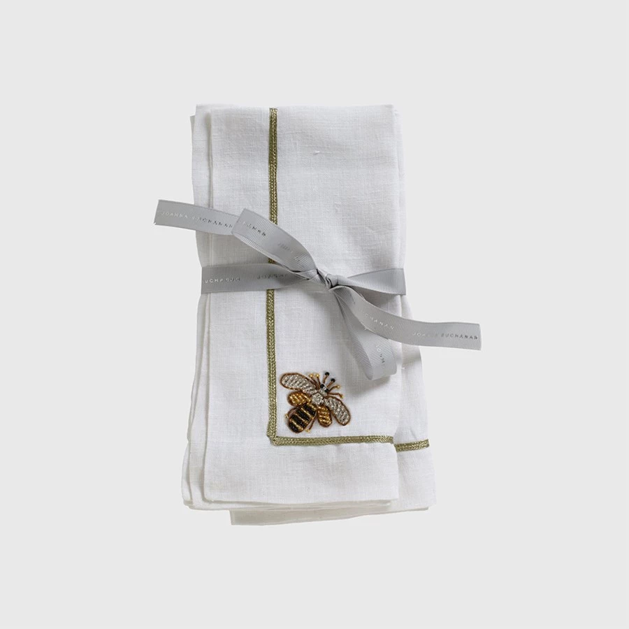 Set the table abuzz with beautiful Stripe Bee Napkins. Each handmade napkin is made of classic white linen, embellished with pieces of shimmering glass beads and a single bee detail for subtle style.
