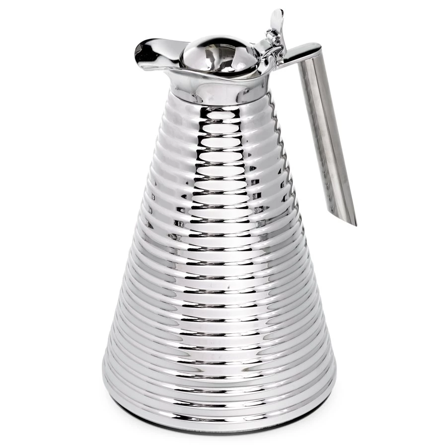 The glass vacuum insulated chrome plated copper carafe offers dynamic aesthetics at first sight. The tapered design is unique and outstanding with a safe and wide base and a conical shape. It is equipped with a specially developed hinged lid with one-hand operation and spout system. 1.0 liter capacity. Glass lining keeps beverages hot for twelve hours or cold for twenty-four. It is not dishwasher safe and cannot be immersed in water; please clean with a wet cloth on the outside. Made in Germany.