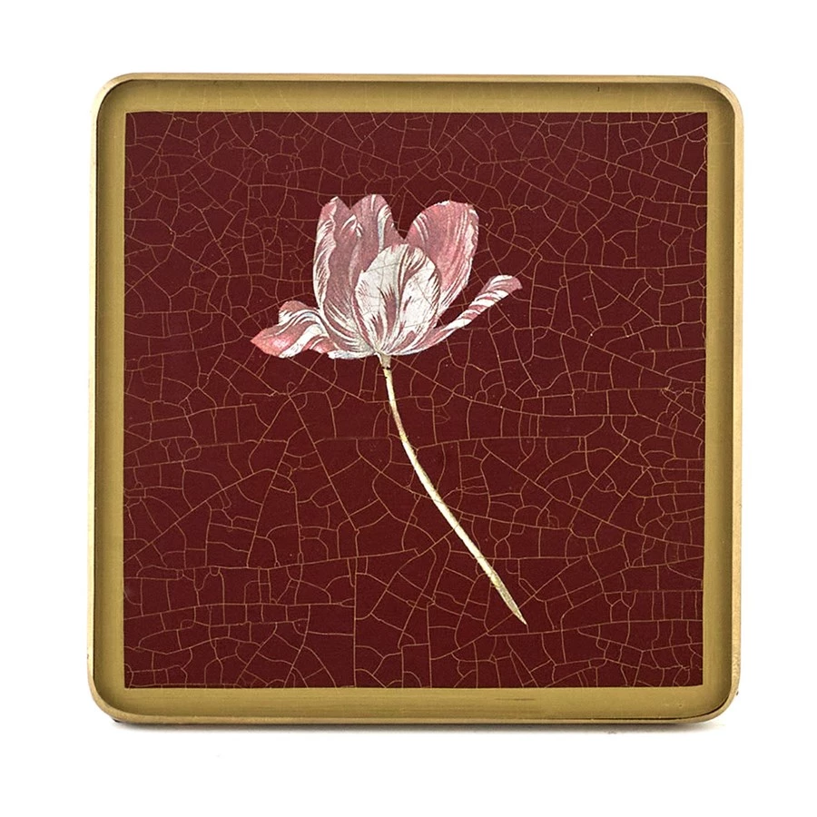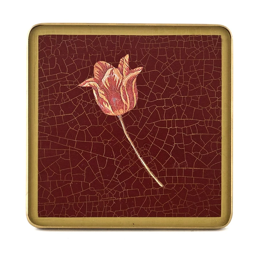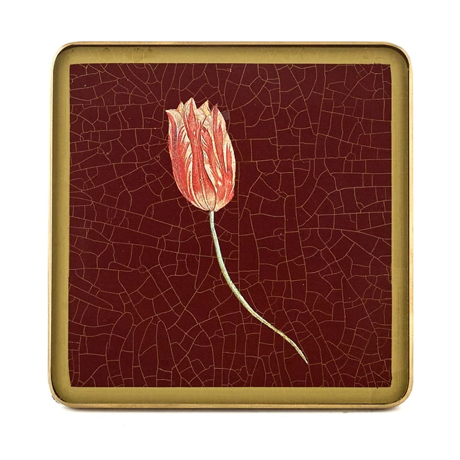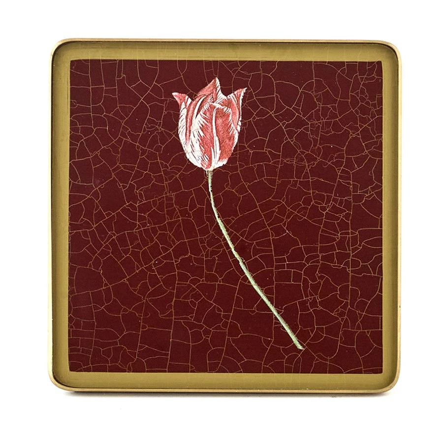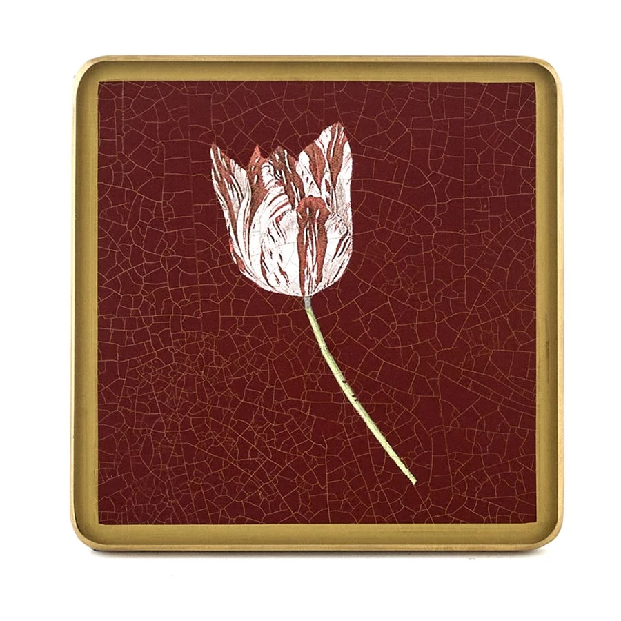 The traditional art of decoupage on glass placemats applies beautifully detailed tulip illustrations over burgundy. Each coaster is then coated with protective and heat-resistant glass with protective felt backing. Handmade in England. Exclusively at Scully & Scully.Â
