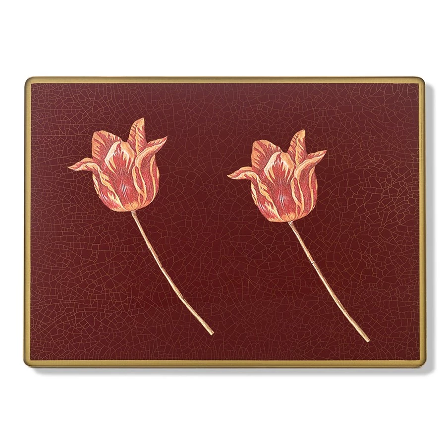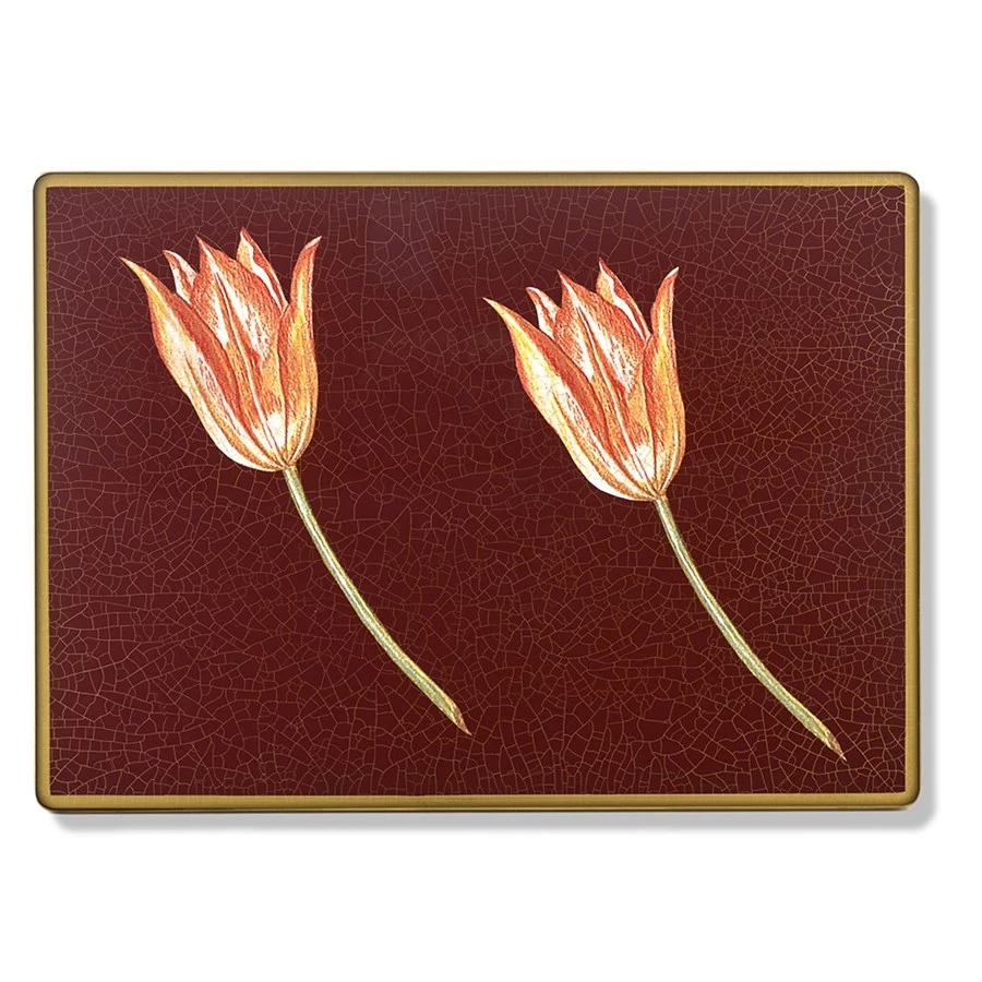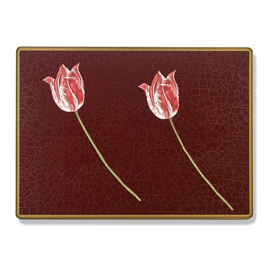 The traditional art of decoupage on glass placemats applies beautifully detailed tulip illustrations over burgundy. Each placemat is then coated with protective and heat-resistant glass with protective felt backing. Handmade in England. Exclusively at Scully & Scully.