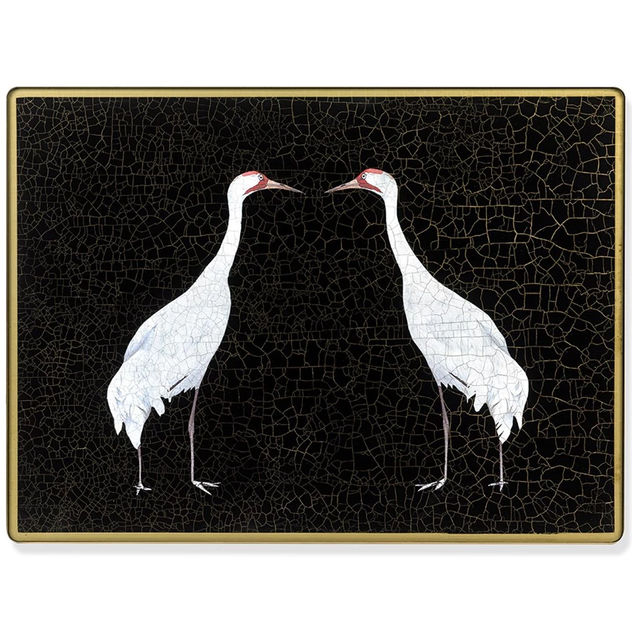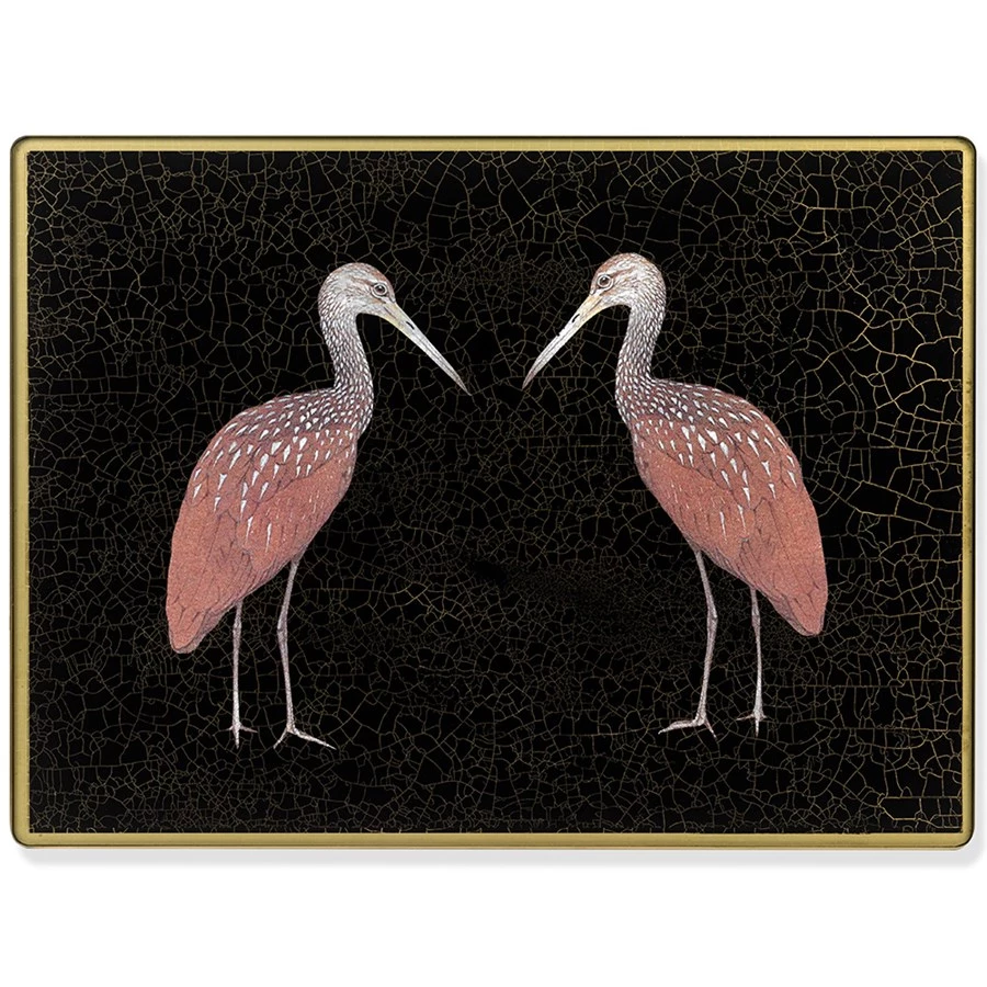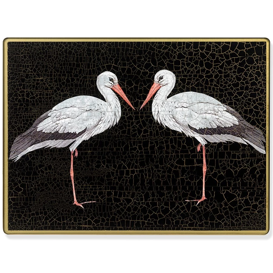 The traditional art of decoupage on mats featuring elegant pairs of waterbirds, with protective felt backing. Glass topped mats can hold warm plates. Handmade in England. Exclusively at Scully & Scully.