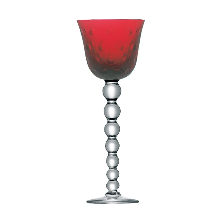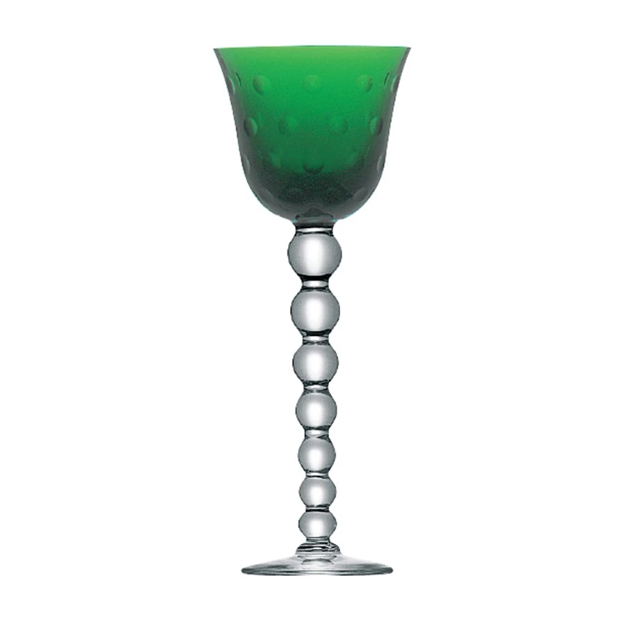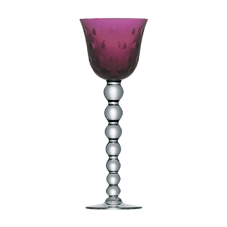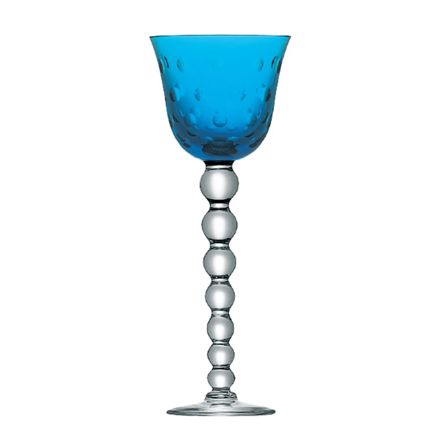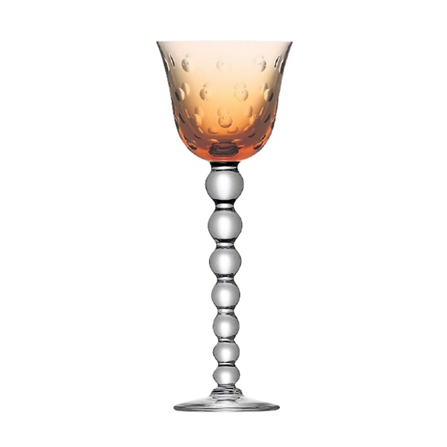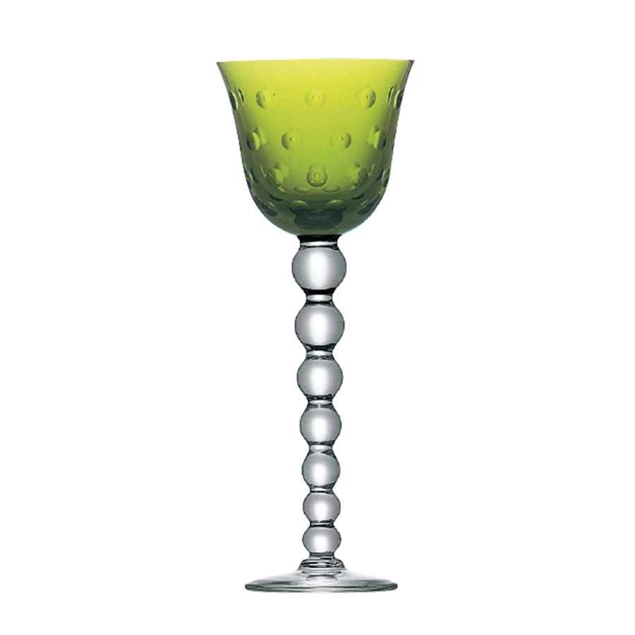 From Saint-Louis, the oldest crystal manufactory in France (since 1586) and a Royal Glassworks since 1767, come these fun & colorful Hock glasses. They are mouthblown and handcut. Vibrant and sensual, designed as part of a vast service of shapes and uses, from tableware to bar patterns, Bubbles reinvigorated the art of creation of clear and colored crystal within Saint-Louis. A mischievous stack of crystal marbles on the stem and bubbles, dotting the parison, are the hallmarks of this original service.
