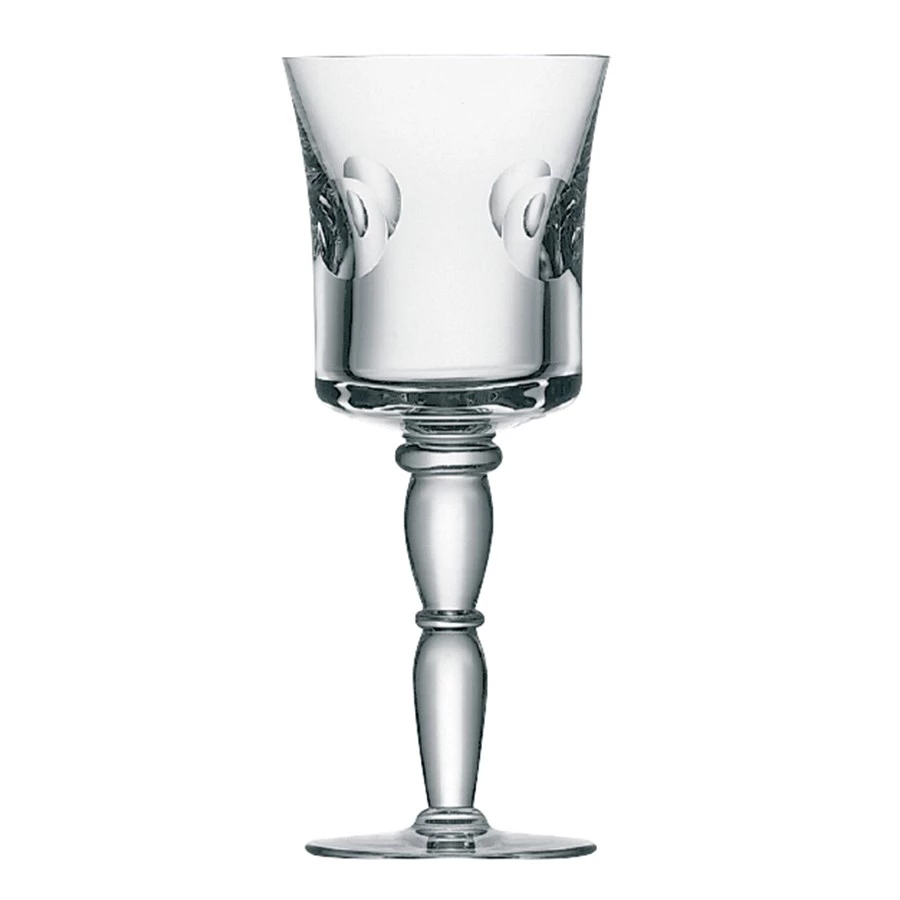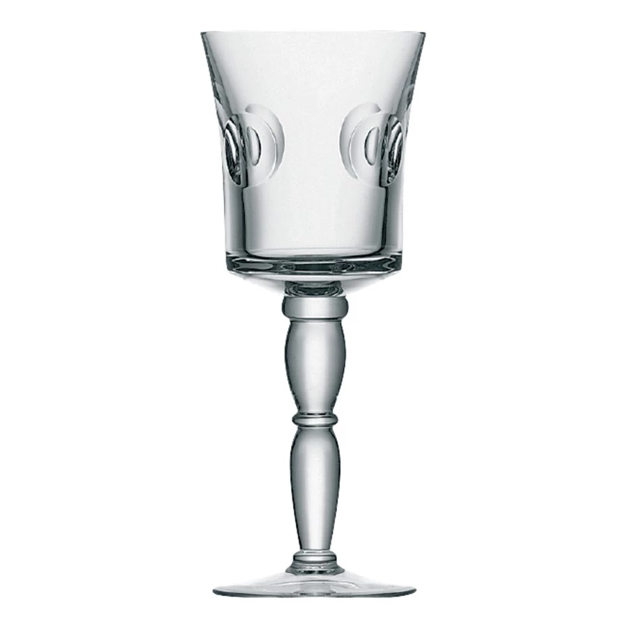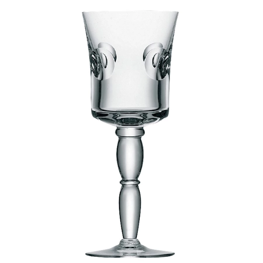 Evoking the beauty and mystery of the cosmos, each piece of this pattern features an unusually squared bowl with handcut dots representing the heavenly bodies. The balanced bowl descends onto a beaded stem, replete with diminishing cinches. Mouthblown and handcut by France’s oldest crystal manufactory.