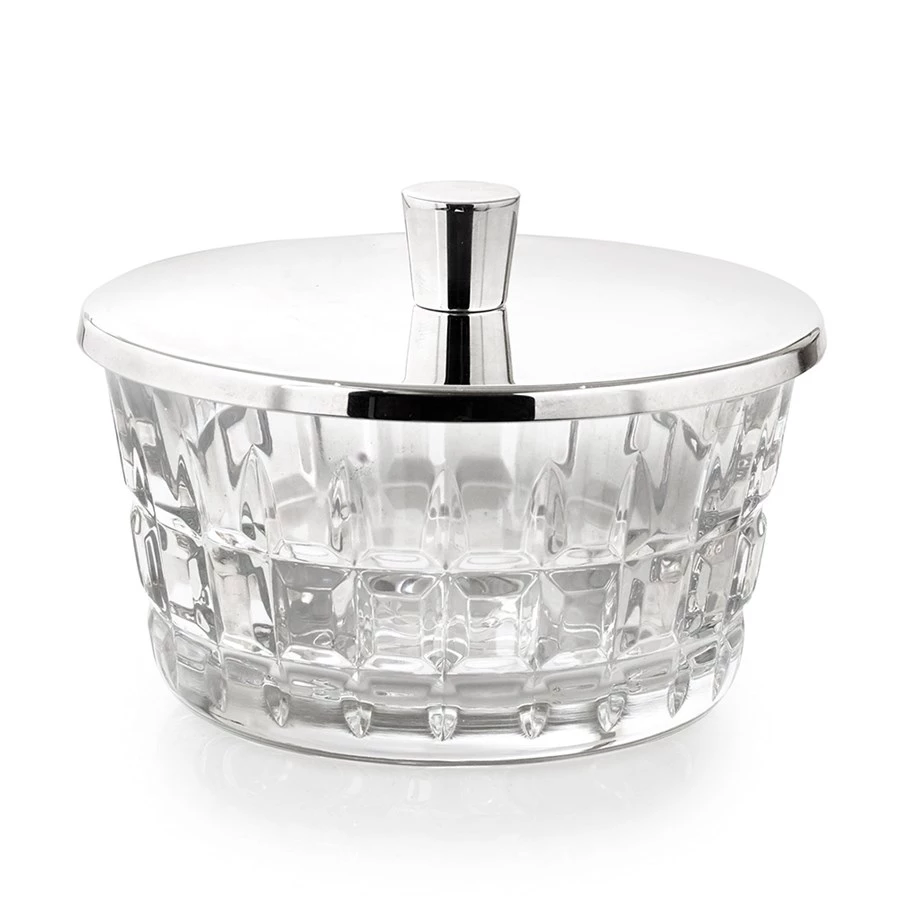 Mixing American inspiration with French conviviality, Manhattan is a fresh take on mixology from St. Louis crystal. Functional and decorative, the bowl is suited for hold cocktail ingredients, bar snacks, or even candy depending on its location in the home. The silver-plated metal lid keeps the ingredients inside fresh. Manhattan is recognized by its modern architectural bevel cuts. Mouthblown and handcut crystal from France’s oldest crystal manufactory.