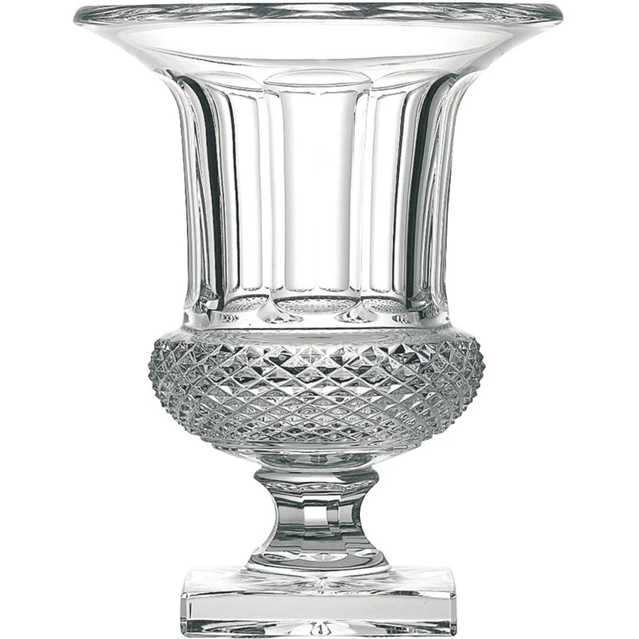 Ornately decorated vases capture the splendor of the Palace of Versailles for modern living. Each vases features a parison adorned with diamond, bevel, pearl and rim cuts with a strong square base with radiating cuts. Mouthblown and handcut in the oldest crystal manufactory in France (since 1586) and a Royal Glassworks since 1767.