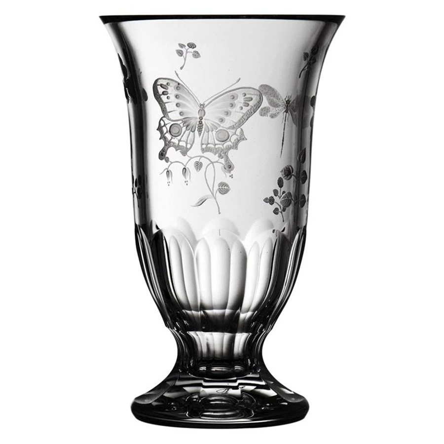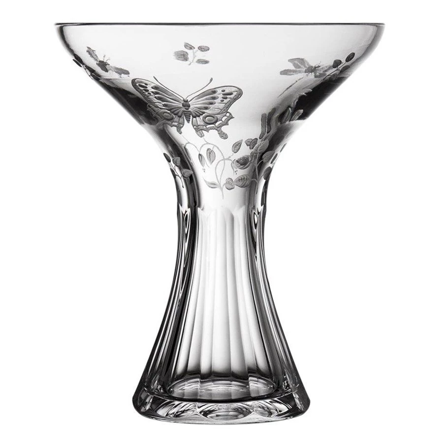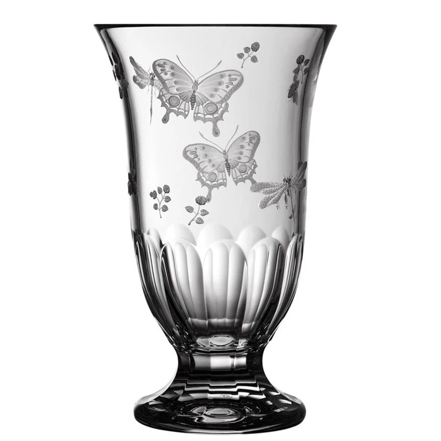 Springtime from Varga turns fine crystal vases into a one-of-a-kind masterpiece. This motif features leaves, bees, dragonflies, butterflies, and even ladybugs on leaves. Stylish and elegant flat cut base with gracefully detailed engraved springtime creatures using copper and diamond wheels. Handmade in Hungary.
