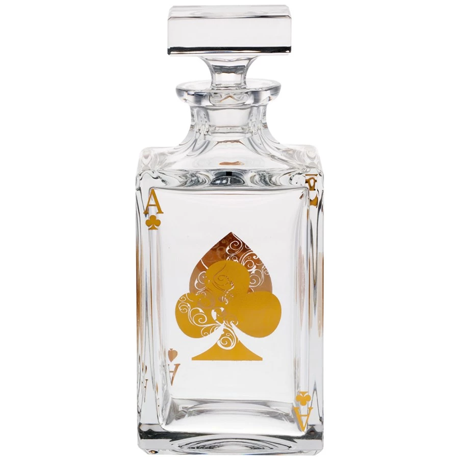 Raise the stakes on game night and serve your finest whiskies in a beautiful mouthblown and handcut crystal decanter from Vista Alegre. The decanter makes a handsome gift and is handpainted in 24k gold accents with one ace from each suit on each side of the clear crystal. Handmade in Portugal.