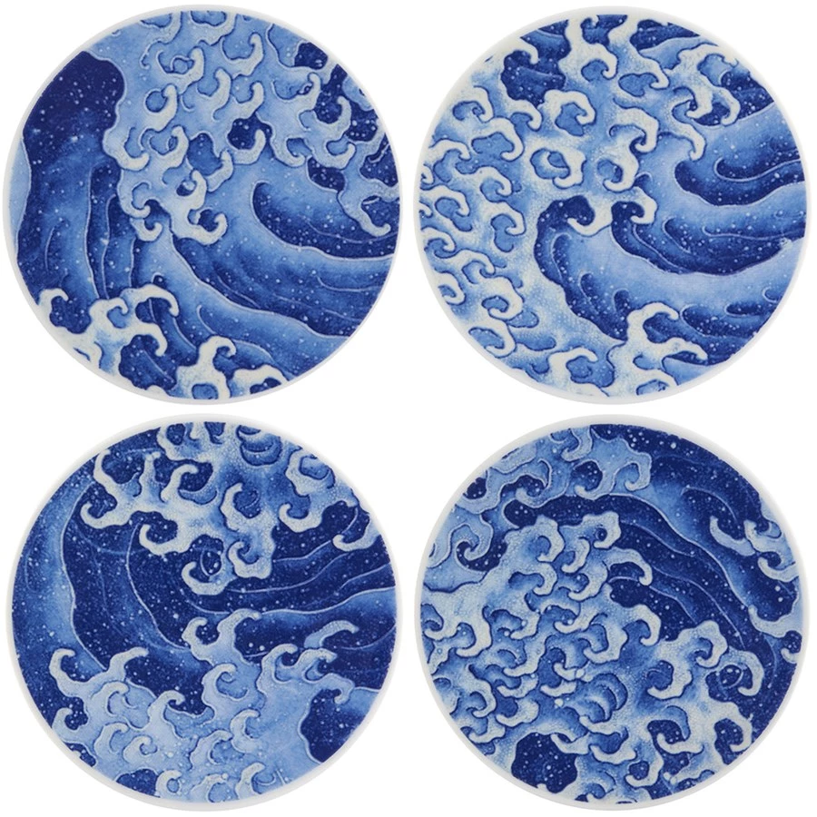 Entertain in easy style with a set of four porcelain coasters from Vista Alegre. The four motifs of this coaster set have been created from the woodblock print “The great Wave of Kanagawa”, by Katsushika Hokusai (1760-1849). One of Japan’s most famous artists, Hokusai produced more than 30,000 works. “The Great Wave of Kanagawa” which inspired this product is considered the world’s most famous Japanese woodblock print, having influenced great creations such as the painting of Claude Monet, the music of Claude Debussy and the literature of Rainer Maria Rilke. Handmade and decorated porcelain from Portugal.