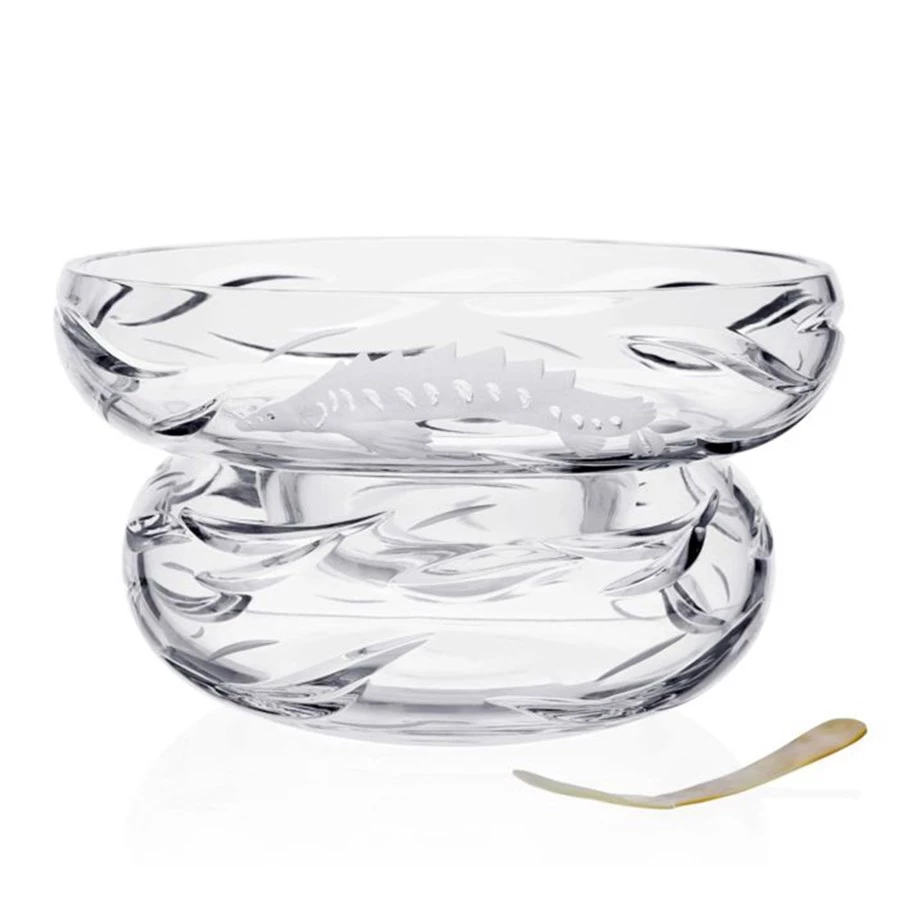 The delightful Persephone pattern features copper-wheel engraved sea creatures that seemingly come to life on the waves of each piece. The Caviar Server expertly engraved with an apropos sturgeon on the caviar dish, which is removable to allow you to fill the bowl with ice to ensure perfect serving temperature. The set includes a handcut and polished mother of pearl spoon. Mouthblown fine European crystal.